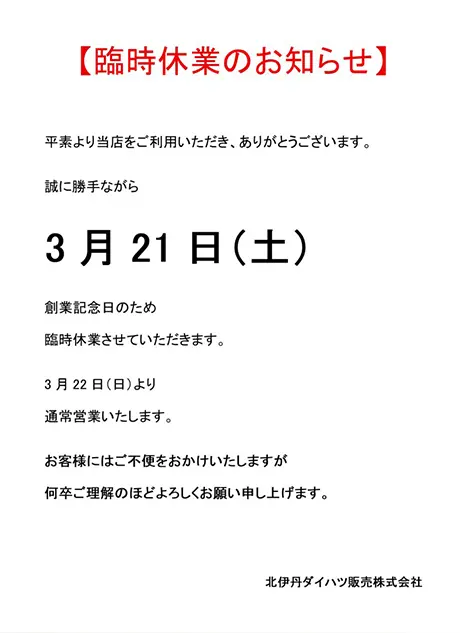 平素より当店をご利用いただき、ありがとうございます。誠に勝手ながら3月21日(土)は創業記念日により臨時休業とさせていただきます。なお、3月22日(日)より通常営業いたします。ご迷惑をおかけいたしますが、よろしくお願いいたします。