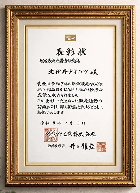 この度、令和7年度「総合表彰優秀販売店」を受賞いたしました。2024年コロナ禍で表彰が見送られた年を除き5年連続の快挙となります。お客様には日頃よりの感謝とともに、今後もより一層ご満足いただける店舗を目指してまいります。