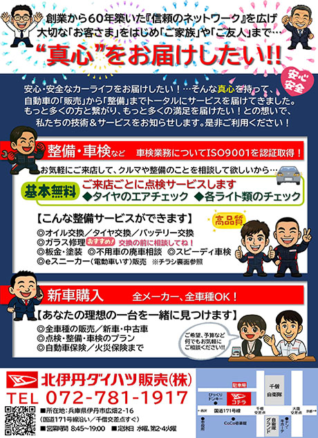 安心・安全なカーライフをお届けしたい!…そんな真心を持って、自動車の「販売」から「整備」までトータルにサービスをお届けしてきました。もっと多くの方とつながり、もっと多くの満足を届けたい!との想いで、私たちの技術&サービスをお知らせします。是非ご利用ください!