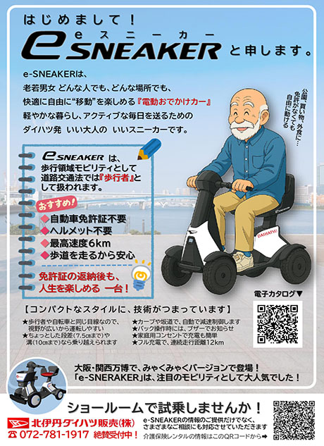 e-SNEAKERは、老若男女どんな人でも、どんな場所でも、快適に自由に"移動"を楽しめる『電動おでかけカー』軽やかな暮らし、アクティブな毎日を送るためのダイハツ発いい大人のいいスニーカーです。