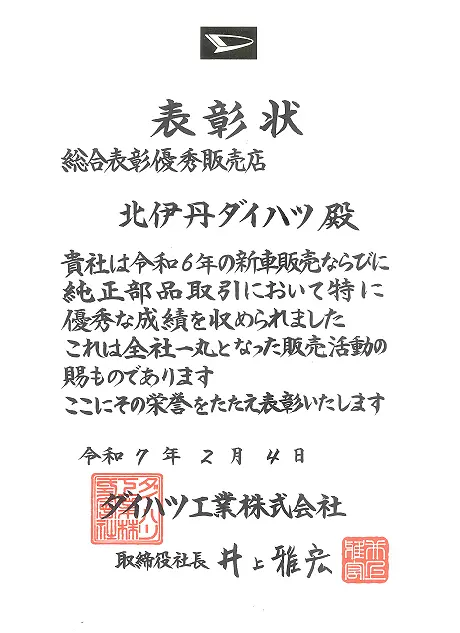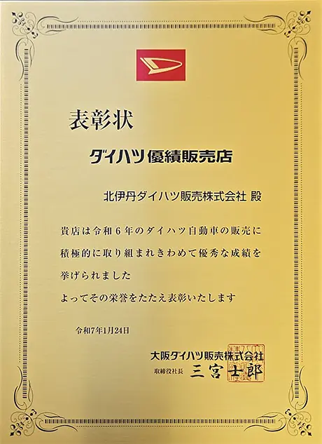 この度、令和6年度「総合表彰優秀販売店」を受賞いたしました。2024年コロナ禍で表彰が見送られた年を除き4年連続の快挙となります。お客様には日頃よりの感謝とともに、今後もより一層ご満足いただける店舗を目指してまいります。