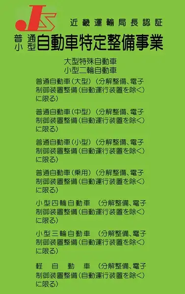 電子制御装置整備作業を行える国の認証を取得しました。自動ブレーキなどに使用される前方を監視するカメラやレーダーなどの調整や自動運行装置の整備についての要件を満たした整備事業者に対し、国土交通大臣の認証を受けたことを証明するものです。